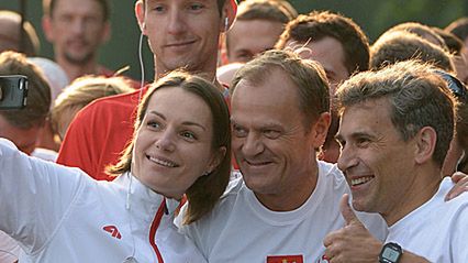 Premier Donald Tusk, posłanka Jagna Marczułajtis-Walczak i czterokrotny mistrz olimpijski w chodzie Robert Korzeniowski na chwilę przed startem Biegu Wolności na Polach Mokotowskich w Warszawie.