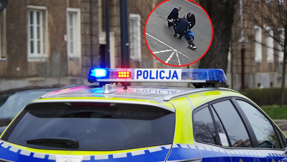 Na wideo widać, jak młody mężczyzna upadł na jezdnię. W pobliżu pojawił się biały ford. Kierowca, który zauważył 32-latka, natychmiast zatrzymał pojazd i podbiegł do drzwi komendy. Na pomoc ruszyli stróże prawa.
