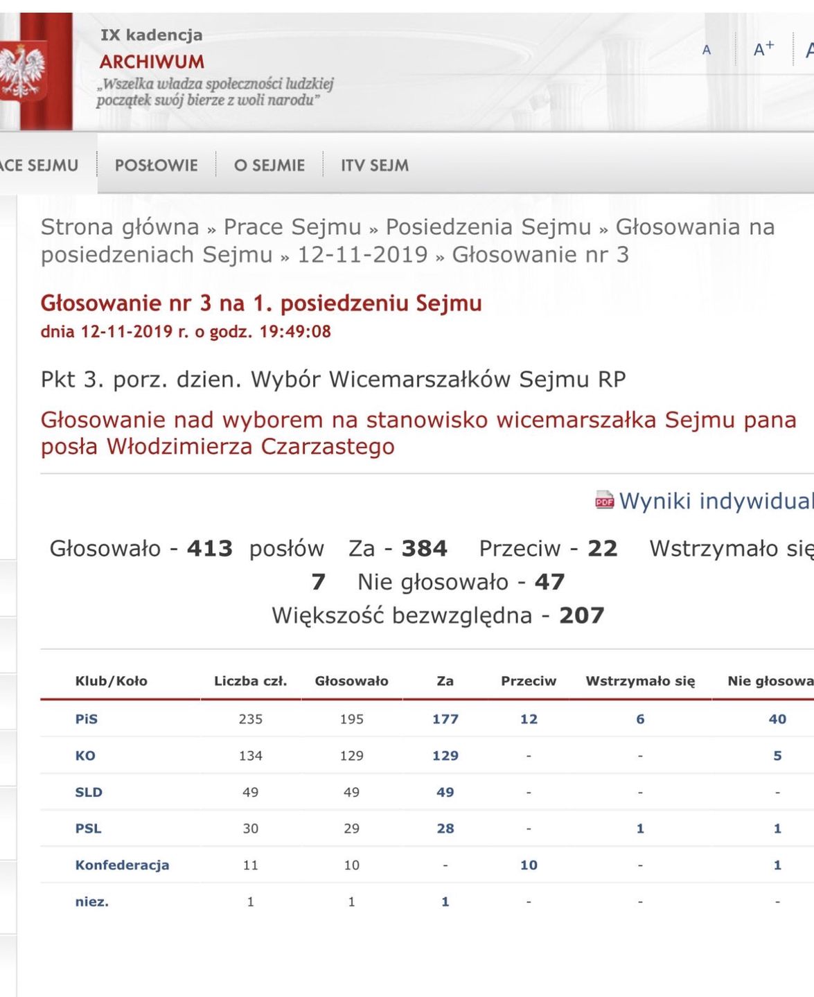 Tymczasem, jak zauważają internauci, m.in. politolog i analityk Marcin Palade, w 2019 roku większość posłów Prawa i Sprawiedliwości głosowała za wyborem Włodzimierza Czarzastego na wicemarszałka Sejmu. "Za" było wówczas 177 posłów, czyli 76 proc. klubu PiS.
