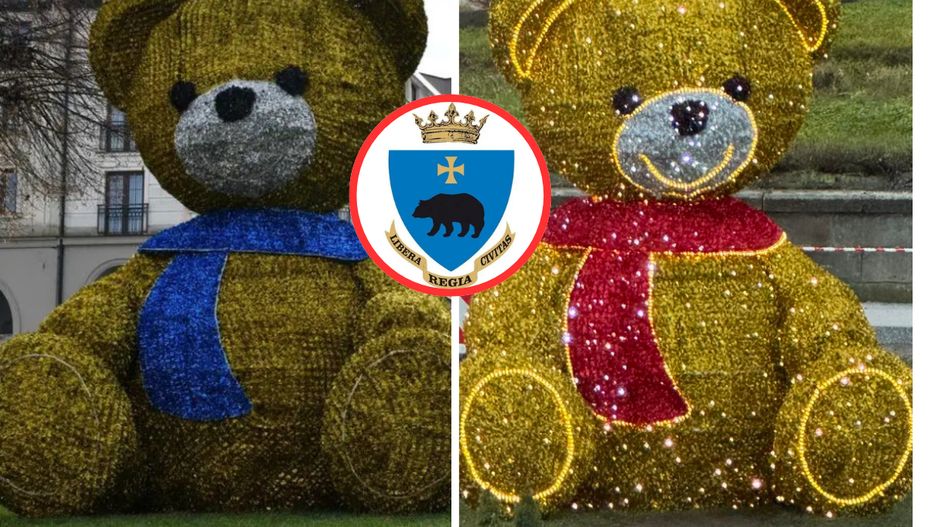 Świąteczny miś ustawiony na rynku w Przemyślu wywołał lawinę komentarzy. Jego barwy, zamiast z herbem miasta, wielu internautów skojarzyło z barwami Ukrainy. Po głosach krytyki musiał zainterweniować prezydent miasta.