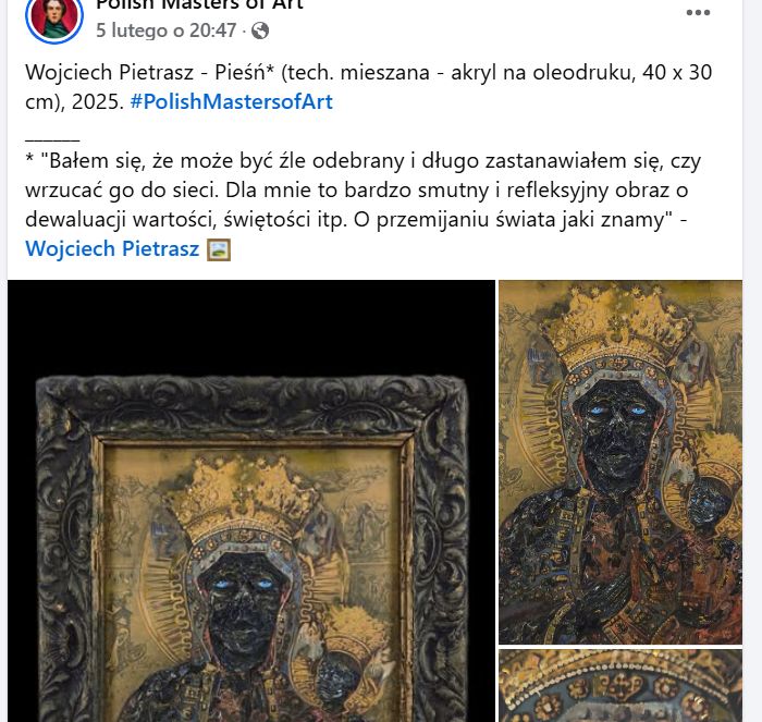 Obraz autorstwa Wojciecha Pietrasza, absolwenta krakowskiej ASP, wywołał falę oburzenia w internecie. Dzieło, mające wymiary 40x30 cm, stworzone w technice mieszanej, przedstawia Matkę Boską Częstochowską z - jak podkreślają niektórzy - przerażającą, czarną twarzą, co wielu internautów uznało za bluźnierstwo.