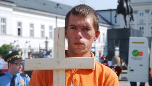 Dariusz Matyjasek przed Pałacem Prezydenckim pojawił się z własnoręcznie wykonanym krzyżem. Choć zacięcie broni krzyża, mówi, że jeśli już miałby zniknąć sprzed Pałacu, należałoby go wcześniej zastąpić na przykład tablicą pamiątkową ze znakiem krzyża. - Będę go dzisiaj nosił sobie. Oddałbym za niego własne życie - mówi, pokazując na krzyż.