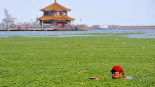 Wybrzeże wzdłuż chińskiej miejscowości Qingdao zmieniło się nie do poznania. Na powierzchni wody pojawił się zielony szlam. To atak glonów, które chociaż nie są szkodliwe dla zdrowia, to niewątpliwe będą miały niekorzystny wpływ na miejscowe rybołówstwo. Co ciekawe inwazja zielonych alg nie przeszkadza niektórym amatorom kąpieli w zanurzeniu się w morskiej wodzie.
