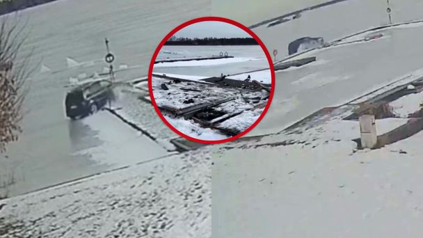 Kuriozalne sceny zarejestrowały kamery monitoringu nad Zalewem Zegrzyńskim. Na nagraniu widać jak pojazd osobowy jedzie po zamarzniętej tafli wody, a następnie uderza w pomost.