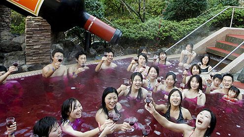 Hakone, Japonia, 20.11.2008 Goście wznoszą toast z okazji święta Beaujolais Nouveau w basenie w Hakone Yunessun spa, jednym z największych japońskich uzdrowisk z gorącymi źródłami 100 km na południowy zachód od Tokio. Goście kąpali się i pływali w odkrytym basenie napełnionym czerwonym winem. Święto Beaujolais Nouveau jest w Japonii hucznie obchodzone. Wszystko za sprawą niedawno zniesionego zakazu importu win.