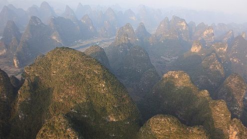 Krajobraz nad Yangshuo w południowo-zachodnich Chinach. Yangshuo jest jedynym regionem, w którym turyści mogą swobodnie podziwiać piękno krajobrazu z lotu ptaka. W pozostałej części Chin jest to ściśle zabronione ze względu na całkowitą kontrolę przestrzeni powietrznej przez wojsko.