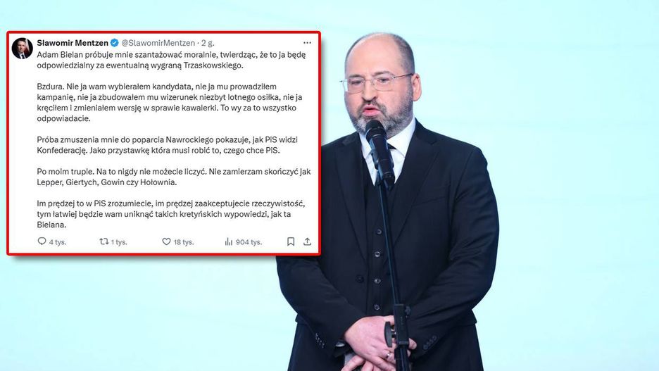 "Po moim trupie. Na to nigdy nie możecie liczyć. Nie zamierzam skończyć jak Lepper, Giertych, Gowin czy Hołownia. Im prędzej to w PiS zrozumiecie, im prędzej zaakceptujecie rzeczywistość, tym łatwiej będzie wam uniknąć takich kretyńskich wypowiedzi, jak ta Bielana" – podsumował Mentzen.