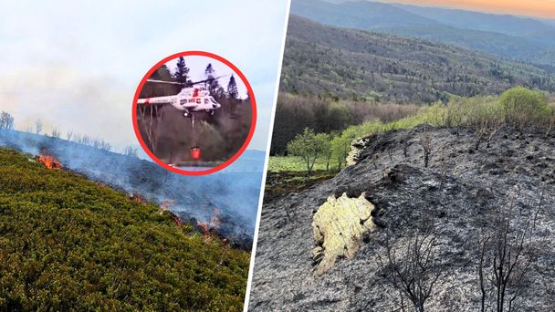 Niepokojące obrazki z Bieszczadzkiego Parku Narodowego. W majówkę ogień pojawił się na wzgórzach, w trudno dostępnych terenach między Krzemieniem i Obnogą. Państwowa Straż Pożarna i Straż Graniczna opublikowała nagrania i zdjęcia z akcji gaśniczej. Do gaszenia pożaru potrzebny był śmigłowiec. W pewnym momencie można zauważyć, jak pilot obniża maszynę i pobiera wodę z pobliskiego zbiornika. Następnie przelatuje nad krytycznymi miejscami i spuszcza wodę na palące się suche trawy. W akcji gaśniczej brało udział ponad 60 strażaków i ponad 30 osób z innych służb, takich jak m.in. straż graniczna i GOPR. Wykorzystywano też quady i drony, by przyśpieszyć całą akcję. "Wpierw patrol Służby Parku ugasił jedno zarzewie ognia o powierzchni kilkunastu arów na północnych zboczach Krzemienia około godz. 16.00. Współdziałanie wielu służb przyczyniło się do ugaszenia drugiego zarzewia ognia, który wypalił ponad 1 ha powierzchni suchych traw połoninowych na północnych stokach Bukowego Berda" - przekazał Bieszczadzki Park Narodowy. Jak zapewnia administracja parku, ogień pojawił się dziś w miejscach nieudostępnionych dla turystów. Zwrócił też uwagę, że wiał dość silny wiatr, który mógł przyczynić do rozprzestrzenienia ognia. Sytuację opanowało ok. 100 strażaków.