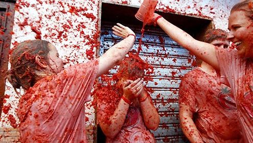 Podczas festiwalu "Tomatina" ludzie bombardują się pomidorami! W miasteczku Bucol w Walencji (południowo - wschodnia Hiszpania) dziesiątki tysięcy biesiadników z całego świata obrzuca się tonami pomidorów. Niektórzy uważaj ten festiwal za bzdurny. Jednak przyłącza się do niego sama rada miasta. W tym roku radni przywieźli na samochodach około 100 ton przejrzałych pomidorów dla oszacowanych 40 000 turystów, którzy przybyli do zaledwie 9 000 miasta Bucol. Festiwal odbywa się co roku już od ponad 60 lat.