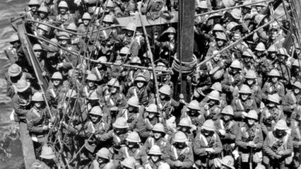Na zdjęciu: brytyjscy strzelcy na małym statku, który miał ich przetransportować z okrętu SS Nile na brzeg. Maj 1915.