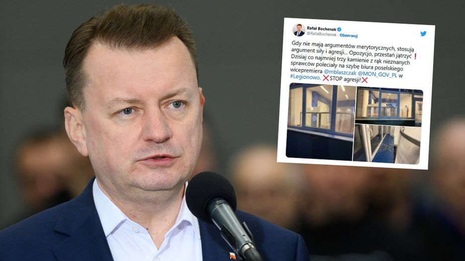 "Gdy nie mają argumentów merytorycznych, stosują argument siły i agresji... Opozycjo, przestań jątrzyć. Dzisiaj co najmniej trzy kamienie z rąk nieznanych sprawców poleciały na szybę biura poselskiego wicepremiera, szefa MON Mariusz Błaszczaka w Legionowie" - napisał na Twitterze rzecznik PiS.