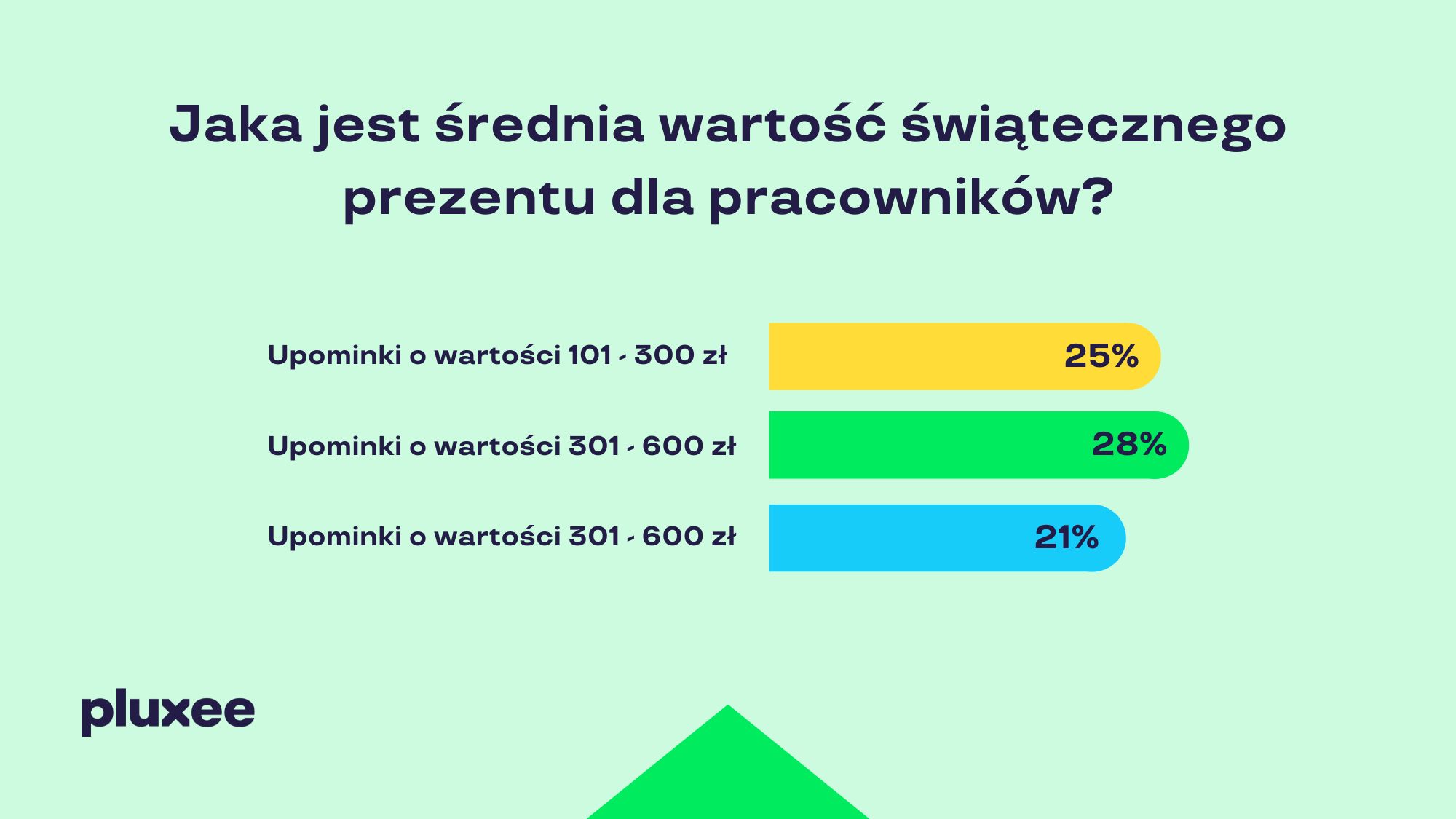 ● Pracownicy najczęściej otrzymują świąteczne upominki o wartości 101-300 zł (25%), 301-600 zł (28%) oraz 601-1000 zł (21%).