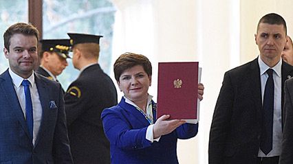 Na zdjęciu premier Beata Szydło w drodze do marszałka Sejmu po posiedzeniu rządu, na którym przyjęto projekt ustawy wprowadzającej program "Rodzina 500 plus".