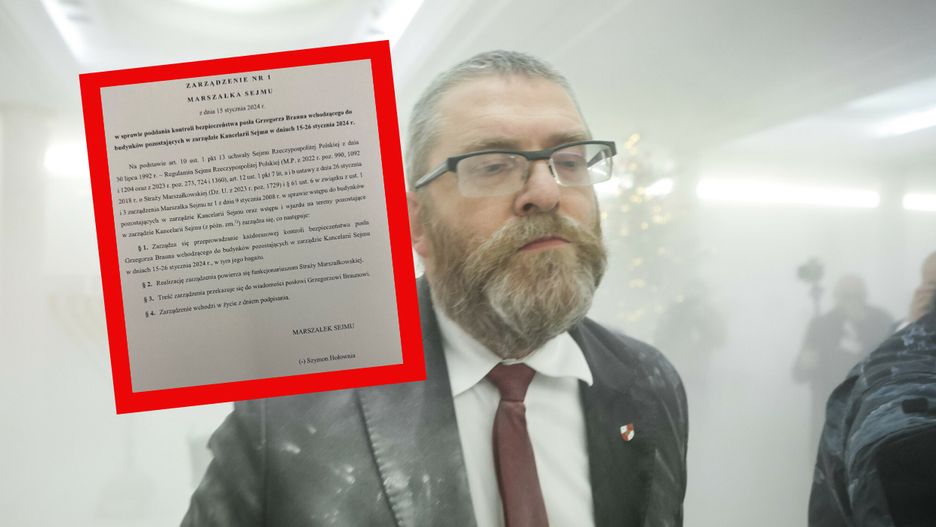 "Zarządza się przeprowadzanie każdorazowej kontroli bezpieczeństwa posła Grzegorza Brauna wchodzącego do budynków pozostających w zarządzie Kancelarii Sejmu w dniach 15-26 stycznia, w tym jego bagażu" - można przeczytać w opublikowanym dokumencie.
