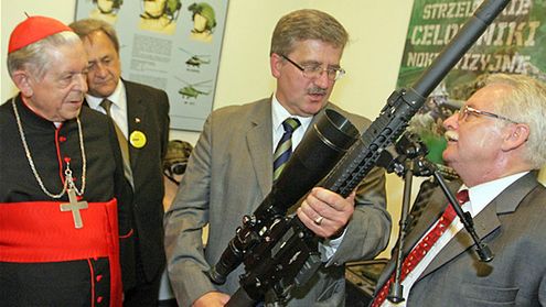 Warszawa, 04.09.2008 r. Kardynał Józef Glemp (L), marszałek Sejmu RP Bronisław Komorowski (C) oraz dyrektor Przemysłowego Centrum Optyki S.A. Jacek Podwysocki (P) podczas uroczystości otwarcia nowej siedziby Przemysłowego Centrum Optyki.