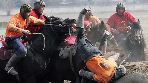 Z okazji święta Nouruz (Nowy Rok obchodzony w dniu równonocy wiosennej) w Kirgistanie zorganizowano zawody gry zespołowej zwanej kok-boru, lub buzkaszi. Jest to tradycyjny w Azji Środkowej sport, gdzie jeźdźcy na koniach mają za zadanie poderwać z ziemi zwłoki kozła z urwaną głową. Nazwa "buzkaszi" znaczy dosłownie "wydzieranie sobie kozy".