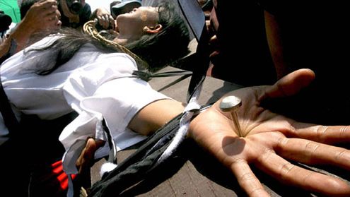 Ruben Enaje (po prawej) wisi na krzyżu już po raz 24. Gwoździe wbijane po raz kolejny w to samo miejsce sprawiają ogromne cierpienie.