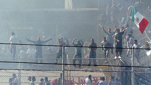 Więźniowie zebrani na dachu jednego z budynków więziennych, wywiesili baner z napisem w języku hiszpańskim: "sprawiedliwość strażnicy zabójcy".