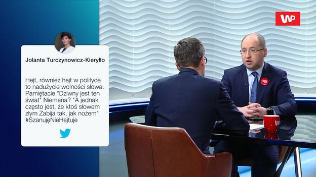 Jolanta Turczynowicz-Kieryłło stwierdziła, że korzystanie z wolności słowa "może prowadzić do zagrożeń". Co na to rzecznik sztabu wyborczego Andrzeja Dudy Adam Bielan? W programie "Tłit" podpisał się pod kontrowersyjnymi słowami. - Hejt to przykład nadużycia wolności słowa. Jeśli ktoś przychodzi na uroczystości państwowe i krzyczy: prezydencie, ty ch…, czy możemy dalej mówić o wolności słowa, czy o jej nadużyciu? - pytał. - Prezydent odciął się od zorganizowanych przez sztab Kidawy-Błońskiej wydarzeń w Pucku. Kidawa-Błońska była szczęśliwa, że ci ludzie tam byli i wulgarnie obrażali głowę państwa. Nigdy za to nie przeprosiła. To przedsmak tego, jakim będzie prezydentem. Przedsmak brutalnej wojny na górze - dodał.