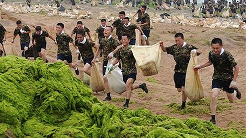 Chińscy żołnierze oczyszczają z alg plażę w Qingdao. Akcja spowodowana jest obawą, iż zalegające na jednej trzeciej powierzchni morza glony, przeszkodzą w realizacji żeglarskich zawodów olimpijskich, rozpoczynających się za miesiąc.