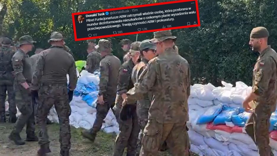 "Funkcjonariusze ABW zatrzymali właśnie osobę, która przebrana w mundur dezinformowała mieszkańców o rzekomym planie wysadzenia wału przeciwpowodziowego" - przekazał Donald Tusk w serwisie X.