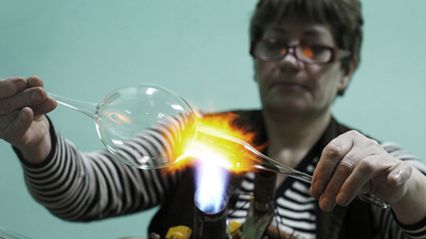 Pracownik fabryki "Szklany Świat" podczas wydmuchiwania bombki.