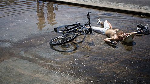 Na zdjęciu rowerzysta chłodzący się w kałuży w Lyonie (Francja).