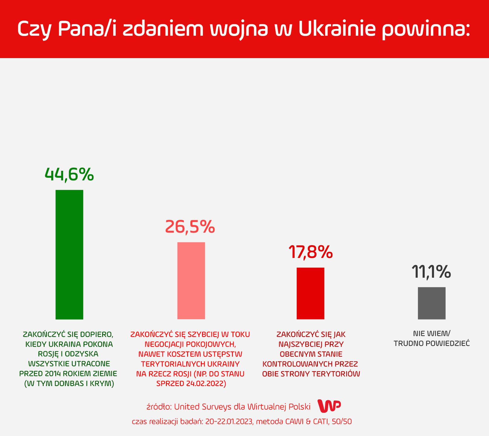 Pracownia United Surveys przeprowadziła na zlecenie Wirtualnej Polski sondaż, w którym zapytała Polaków, w jaki sposób - ich zdaniem - powinna się zakończyć wojna.