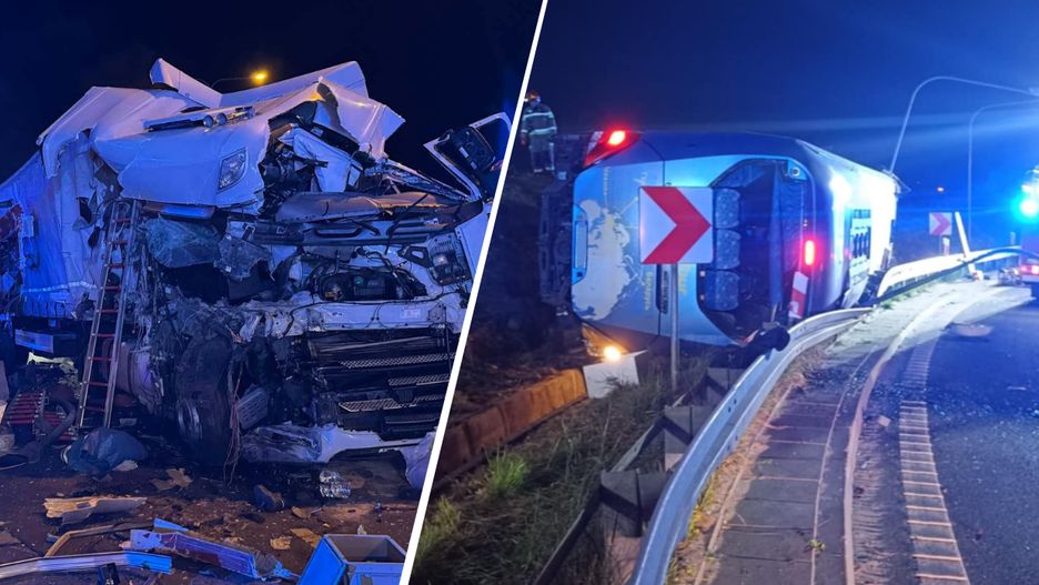 Najpierw przewrócił się autokar. Potem tir uderzył w wóz strażacki