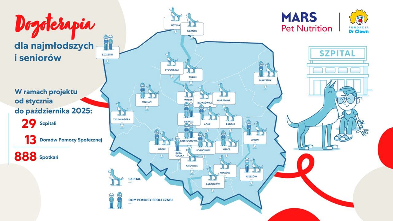 Zwierzęta są coraz częściej włączane do programów terapeutycznych nastawionych na poprawę zdrowia psychicznego i fizycznego. W 2017 roku Mars Polska wspólnie z Fundacją Dr Clown zainicjował ogólnopolski program terapii wspomaganej przez obecność psa połączonej z ,,terapią śmiechem" dla dzieci i młodzieży w szpitalach. Od 2021 roku objął on także seniorów w Domach Pomocy Społecznej. W ciągu 8 lat, od 2017 roku do października 2025, ta wyjątkowa moc merdającego ogona wsparła ponad 39 000 osób, w tym 3 389 seniorów. Obecnie to największy program dogoterapii w Polsce koordynowany przy współpracy organizacji pozarządowej oraz biznesu. Od stycznia do października 2025 roku z zajęć z udziałem certyfikowanych dogoterapeutów i wyszkolonych psów skorzystało 8777 osób – 8303 małych pacjentów w 29 szpitalach dziecięcych i 474 seniorów w 13 Domach Pomocy Społecznej. Co ważne, dogoterapia w DPS-ach odbywa się cyklicznie – seniorzy biorą udział w zajęciach dwa razy w każdym miesiącu – dzięki temu efekty są trwałe i bardziej intensywne niż w przypadku jednorazowych wizyt, a tym samym rośnie rzeczywisty zasięg i wpływ programu.