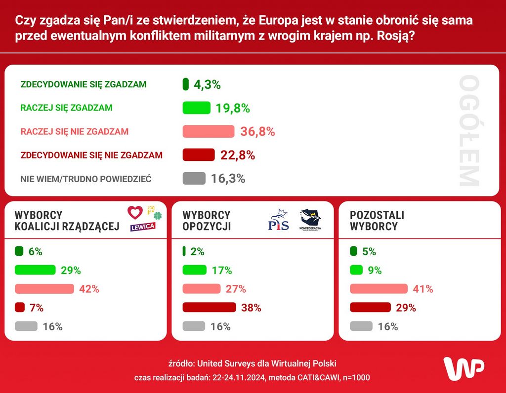 Najwięcej "optymistów" jest wśród wyborców koalicji rządzącej, ale to i tak zaledwie nieco ponad jedna trzecia. 6 proc. udzieliło odpowiedzi "zdecydowanie zgadzam się", a 29 proc. - "raczej zgadzam się". 42 proc. badanych z tej grupy raczej wątpi w to, że Europa obroni się sama, a 7 proc. jest zdecydowanie na nie.