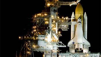 Wahadłowiec Discovery na rampie startowej 39-A w Centrum Lotów Kosmicznych im. Kennedy'ego na Przylądku Canaveral na Florydzie.