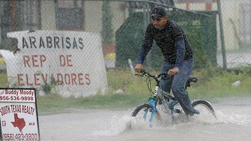 Miasto Los Fresnos w stanie Texas, mieszkańcy opuszczają zalany przez powódź dom.