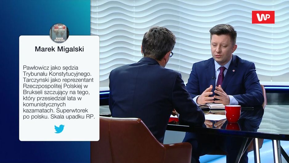 - Pozdrowienia pan przekaże dla brata, a jak nie, to ja przekażę - powiedział Dominik Tarczyński do dziennikarza Adama Michnika w pociągu. Czy PiS powinien zdyscyplinować swojego europosła? - Faktem jest, że brat pana Adama Michnika był byłym prokuratorem wojskowym, który brał udział w skazywaniu osób walczących o niepodległość Polski, ale ja bym tak nie postąpił. Nie akceptuję tego rodzaju form działań. Jeżeli spotkam Dominika, to na pewno zadam mu pytanie, czy to jest dobry pomysł w taki sposób postępować - komentował w programie WP "Tłit" Michał Dworczyk, szef Kancelarii Prezesa Rady Ministrów.