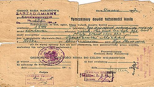 "Tymczasowy dowód tożsamosci konia wystawiony 31 marca 1947 roku dla klaczy, którą posiadał mój dziadek" Bożena