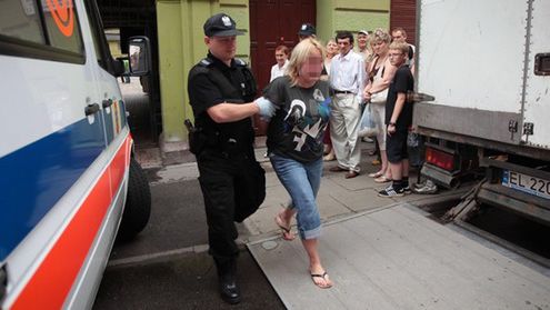 Policjant wyprowadza kobietę z eksmitowanej rodziny.