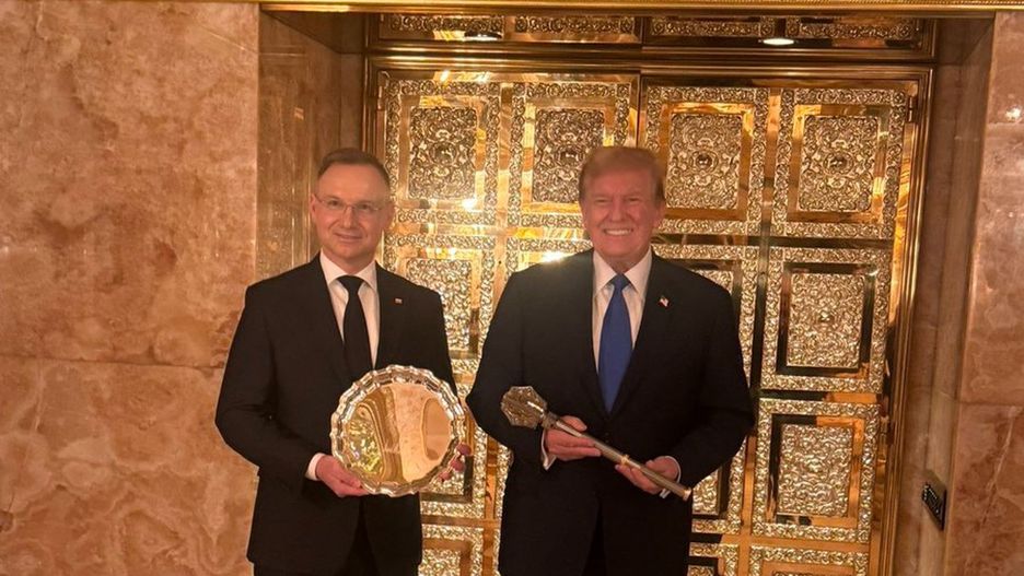 Prezydent Andrzej Duda trzyma w dłoniach tacę, a kandydujący do urzędu prezydenta USA Trump coś, co przypomina berło lub buzdygan. W komunikacie sztabu Trumpa nie wspomniano jednak słowem o tych przedmiotach.