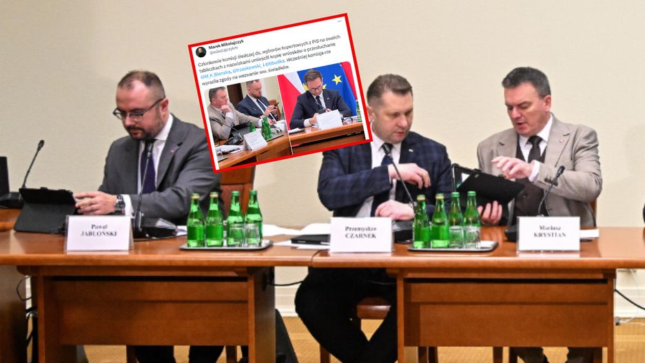 "Członkowie z PiS na swoich tabliczkach z nazwiskami umieścili kopie wniosków o przesłuchanie Małgorzaty Kidawy-Błońskiej, Rafała Trzaskowskiego i Borysa Budki. Wcześniej komisja nie wyraziła zgody na wezwanie ww. świadków" - napisał w serwisie X dziennikarz "DGP" Marek Mikołajczyk.