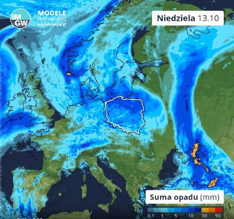 W niedzielę, 13 października, Polska będzie w zasięgu niżu z frontami atmosferycznymi, którego ośrodek przemieści się znad Morza Północnego, przez Danię i południowy Bałtyk, nad Estonię. Nadal będzie napływać dość chłodne powietrze polarne morskie. Nastąpi spadek, a potem wzrost ciśnienia.