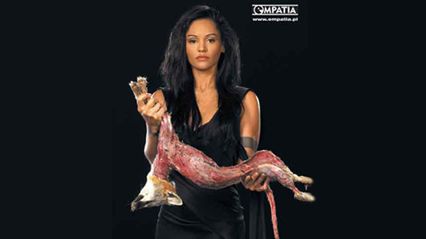 Plakat dostępny na stronach Futro.empatia.pl. W kampanii wzięła udział amerykańska aktorka Persia White.