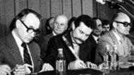 31.08.1980 Mieczysław Jagielski i Lech Wałęsa podpisali porozumienie w Stoczni Gdańskiej (PAP)