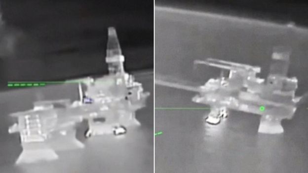 Na nagraniu można zauważyć trzy różne platformy wiertnicze należące do koncertu naftowego Łukoil. Kamery bezzałogowców uchwyciły moment tuż przed uderzeniem w cel.