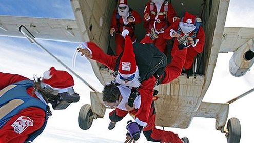 Mikołaje przygotowują się do skoku, tym razem z samolotu, renifery mają wolne.