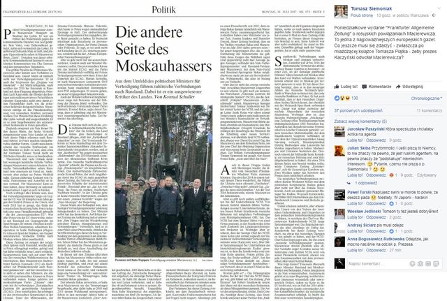 Wcześniej "Frankfurter Allgemeine Zeitung" pisał o niejasnych powiązaniach Bartosza Kownackiego, wiceministra obrony narodowej i prawej ręki Antoniego Macierewicza.
