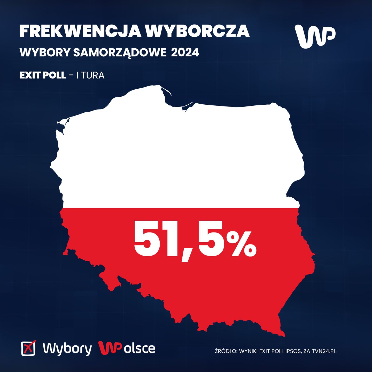 Jak wynika z sondażu exit poll IPSOS (za: tvn24.pl), frekwencja w wyborach samorządowych wyniosła 51,5 proc.