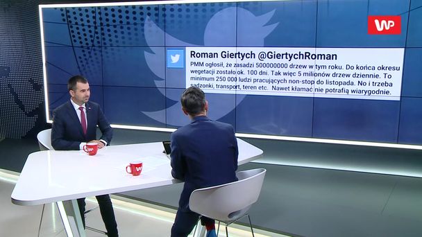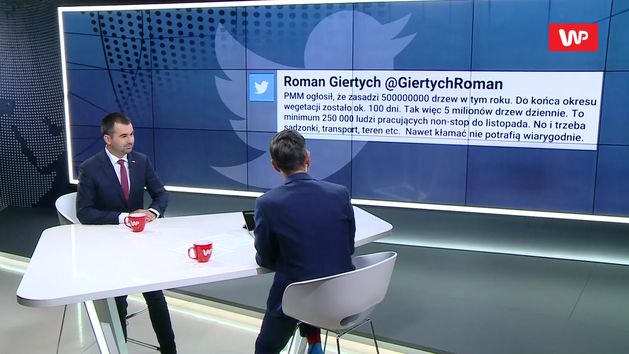 "PMM ogłosił, że zasadzi 500000000 drzew w tym roku. Do końca okresu wegetacji zostało ok. 100 dni. Tak więc 5 milionów drzew dziennie. To minimum 250 000 ludzi pracujących non-stop do listopada. No i trzeba sadzonki, transport, teren etc. Nawet kłamać nie potrafią wiarygodnie" - napisał Roman Giertych. Co na to rzecznik prezydenta? - Pierwsza rzecz: gratuluję Giertychowi znajomości matematyki - z tej strony jeszcze go nie poznaliśmy. Druga rzecz: Lasy Państwowe co roku sadzą 500 mln drzew. Trzecia rzecz: Pałac Prezydencki, wspólnie z Lasami Państwowymi, przeprowadził w tym roku akcję "Sadzimy las". Byliśmy z parą prezydencką w Rytlu, zasadziliśmy 100 hektarów lasu. Ta akcja będzie kontynuowana - zapewniał Błażej Spychalski w programie "Tłit".