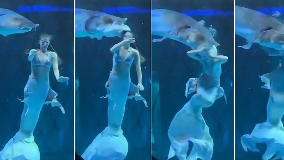 Widać na nim animatorkę przebraną za syrenę, która za szybą, przed zgromadzonymi widzami, nagle zostaje zaatakowana przez gigantycznego jesiotra. Zwierzę rzuciło się na kobietę, próbując chwycić jej głowę w swoje szczęki.