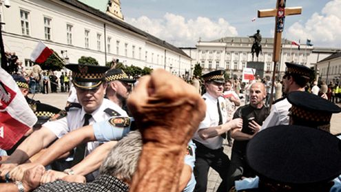 Krzyż i rozjuszony tłum przed Pałacem - zdjęcia