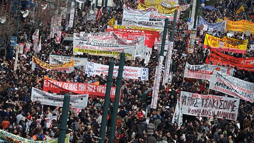 Do starć z policją doszło podczas przemarszu ulicami Aten ponad 10 tys. demonstrantów sprzeciwiających się drakońskim środkom oszczędnościowym zapowiedzianym przez rząd Grecji w ramach walki z kryzysem finansów publicznych. 24-godzinny strajk generalny zorganizowanego przez związki zawodowe sparaliżował ruch lotniczy i transport publiczny w całym kraju. W Atenach zebrały się dwie demonstracje strajkujących i obie kierują się na plac przed parlamentem.