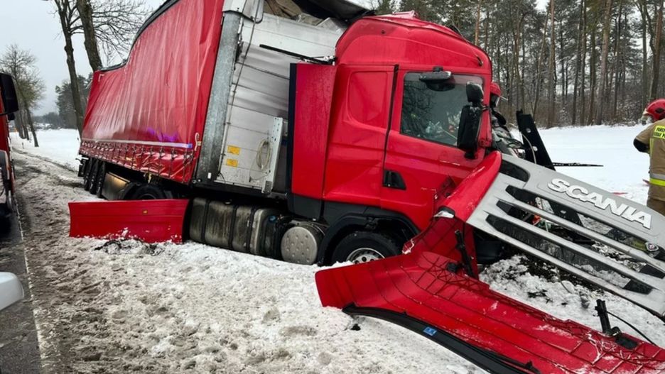 Kabina ciężarówki marki Scania została całkowicie zmiażdżona. Kierowca z obrażeniami został przetransportowany do szpitala. Zostanie od niego pobrana krew do zbadania stanu trzeźwości.